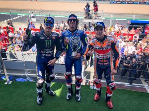 Las Yamaha (Rossi y Viñales) estaban luchando entre ellas mismas por las posiciones de privilegio o lograr un buen lugar en el pódium esto lo aprovechó Rins con su Suzuki y se fue directo a batallar con Marc Márquez que luchaba un poco de mas con su moto pues pareciera que le costaba manejarla, no le encontraba el ritmo. En la novena vuelta el español de Honda ha dejado pasar a su compatriota y contrincante de Suzuki (Rins). Luego Alex volvió a dejar pasar a el campeón actual de la categoría.