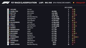 Al final a Hamilton le faltaron vueltas, porque se había acercado a Charles Leclerc, pero no pudo pasarlo, logrando el monegasco quedarse con la victoria del Gran Premio de Bélgica en el circuito de Spa-Francorchamps. Siendo este el piloto más joven en ganar con la escudería Ferrari.