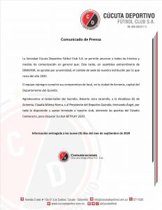Por su parte, la Dimayor y los 36 clubes aprobaron el cambio de sede para los rojinegros y el Centenario de Armenia será la sede donde disputarán los 6 partidos de local (Deportivo Cali, San ta Fe, Envigado, Deportes Tolima, Atlético Junior y América de Cali) de la fase regular que disputará el equipo. A través de un comunicado el club lo hizo oficial.