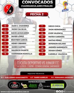 Cúcuta Deportivo y el Junior de Barranquilla se enfrentarán este jueves en el estadio General Santander. Este enfrentamiento es catalogado «de vida o muerte» debido a que el perdedor se quedará en el último lugar con cero unidades, a seis del líder Deportes Tolima.