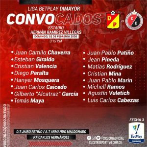 El Cúcuta publicó su lista de viajeros y en esta no se encuentra Johan Arenas, Ronaldo Ariza y Yeison Carabalí, desafectados por decisión técnica. Del lado de las novedades, Juan Pablo Marín, Juan Pablo Patiño y Michell Ramos son convocados para este compromiso, los dos primeros cumplen su primer llamado mientras que Ramos vuelve tras recuperarse de un golpe en la primera fecha.